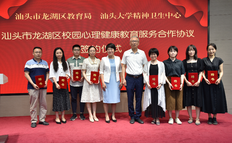 仪式上,区教育局与汕头大学精神卫生中心签订了《汕头市龙湖区校园心理健康教育服务合作协议》。区政府、区教育局有关领导向汕大精神卫生中心八位专家颁发了“龙湖区校园心理健康指导员”聘书。随后区教师发展中心相关领导宣读了成立“龙湖区中小学心理健康教育学科中心教研组”的相关文件。