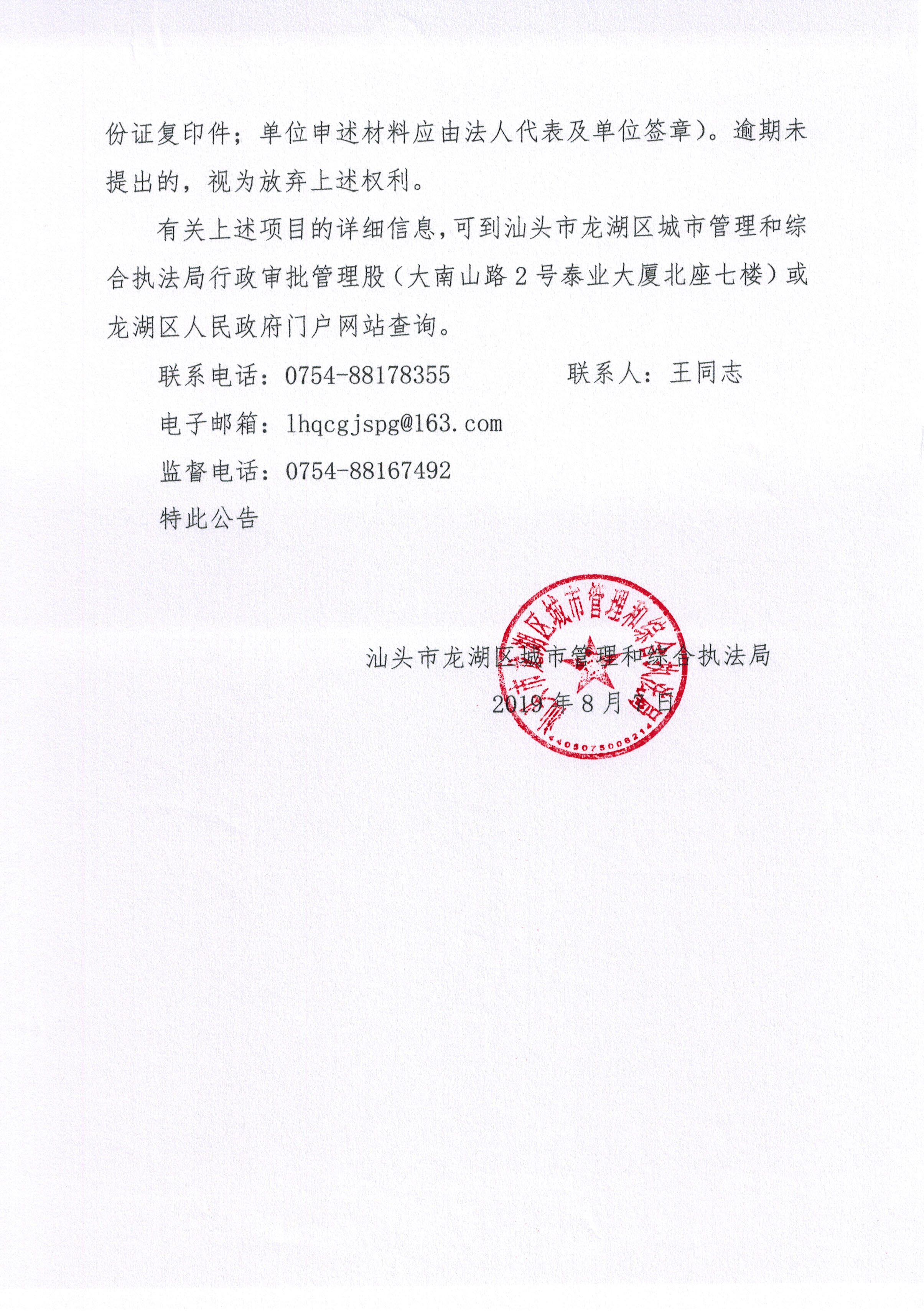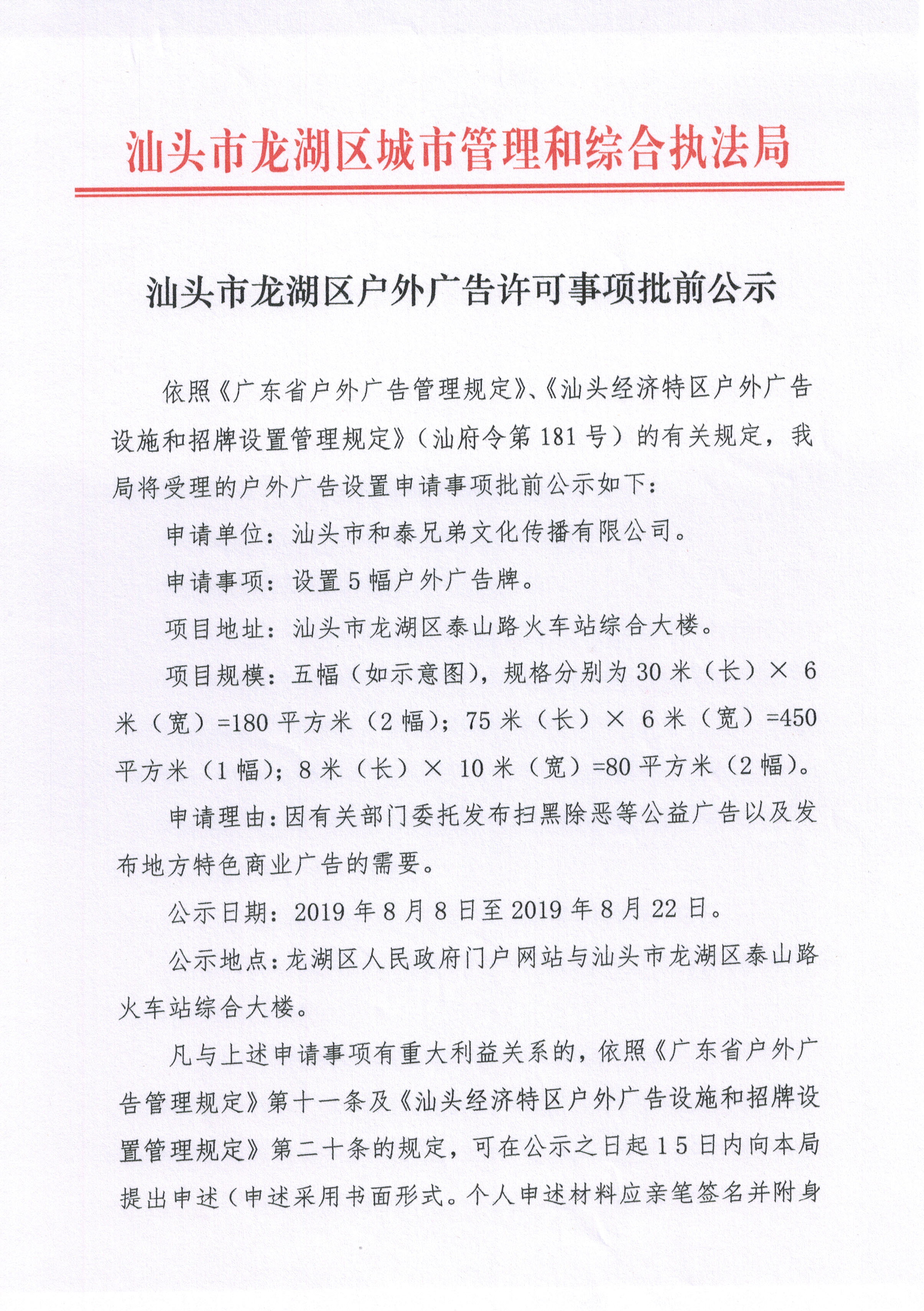 汕头市龙湖区户外广告许可事项批前公示 2019.8.7