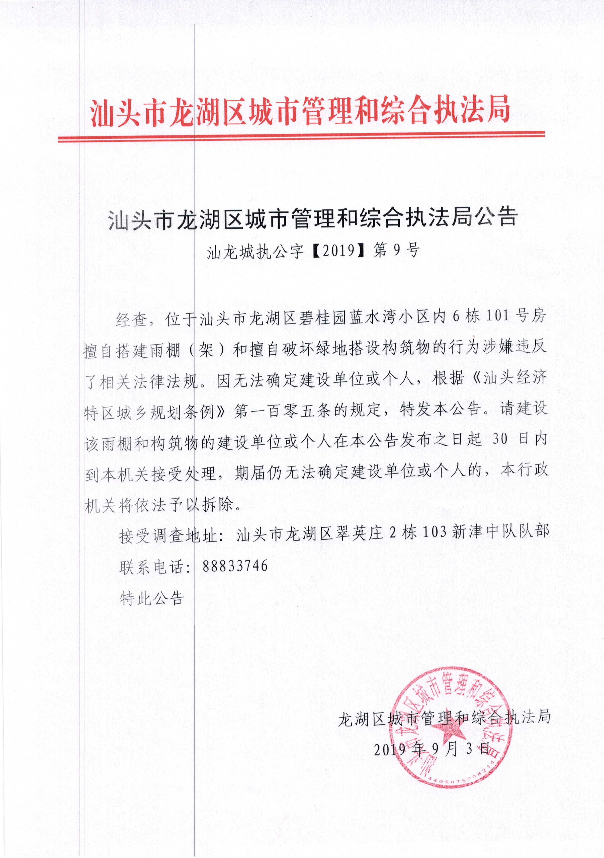 汕头市龙湖区城市管理和综合执法局公告 汕龙城执公字【2019】第9号
