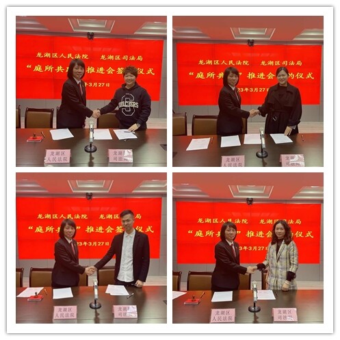 为进一步拓展多元解纷途径,完善基层诉调对接机制,提升矛盾纠纷化解效率,更好服务经济社会高质量发展。3月27日下午,龙湖区司法局金霞司法所、新津司法所、珠池司法所和龙腾司法所与龙湖区人民法院立案庭在法院会议室举行“庭所共建”签约仪式及座谈会,司法所分别与区法院立案庭签署《庭所共建协议》。区法院副院长郭庚亮、区司法局副局长王兆营等出席签约仪式,区司法局、区法院、司法所等相关同志参加仪式。