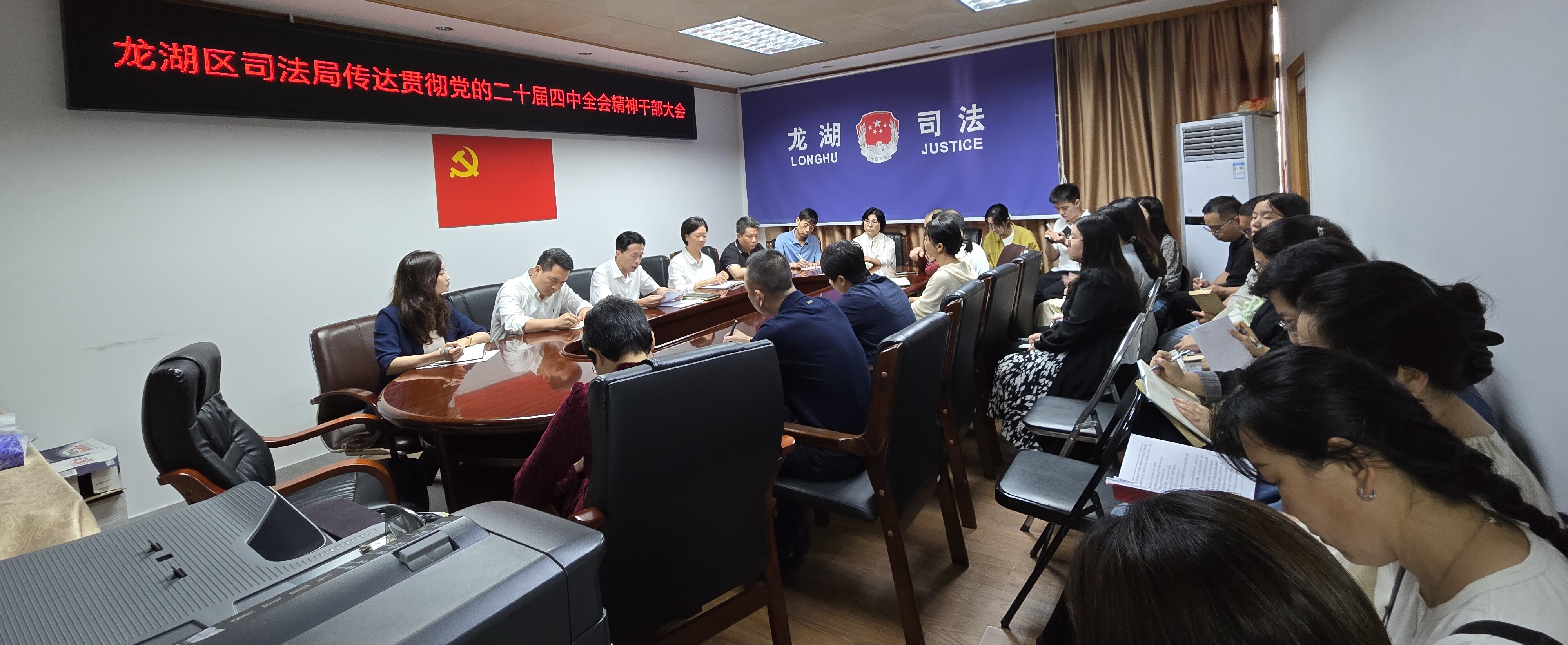 10月29日下午,龙湖区司法局召开干部大会,传达学习贯彻党的二十届四中全会精神。区司法局党组书记、局长陈东晓主持并讲话。