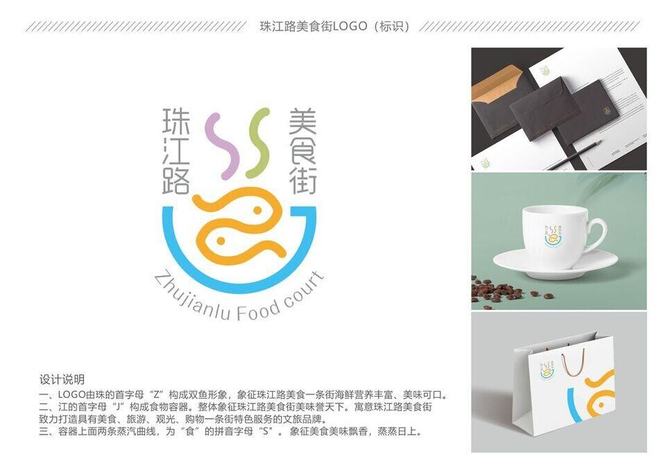 二、江的首字母"J"构成食物容器。整体象征珠江路美食街美味誉天下。寓意珠江路美食街