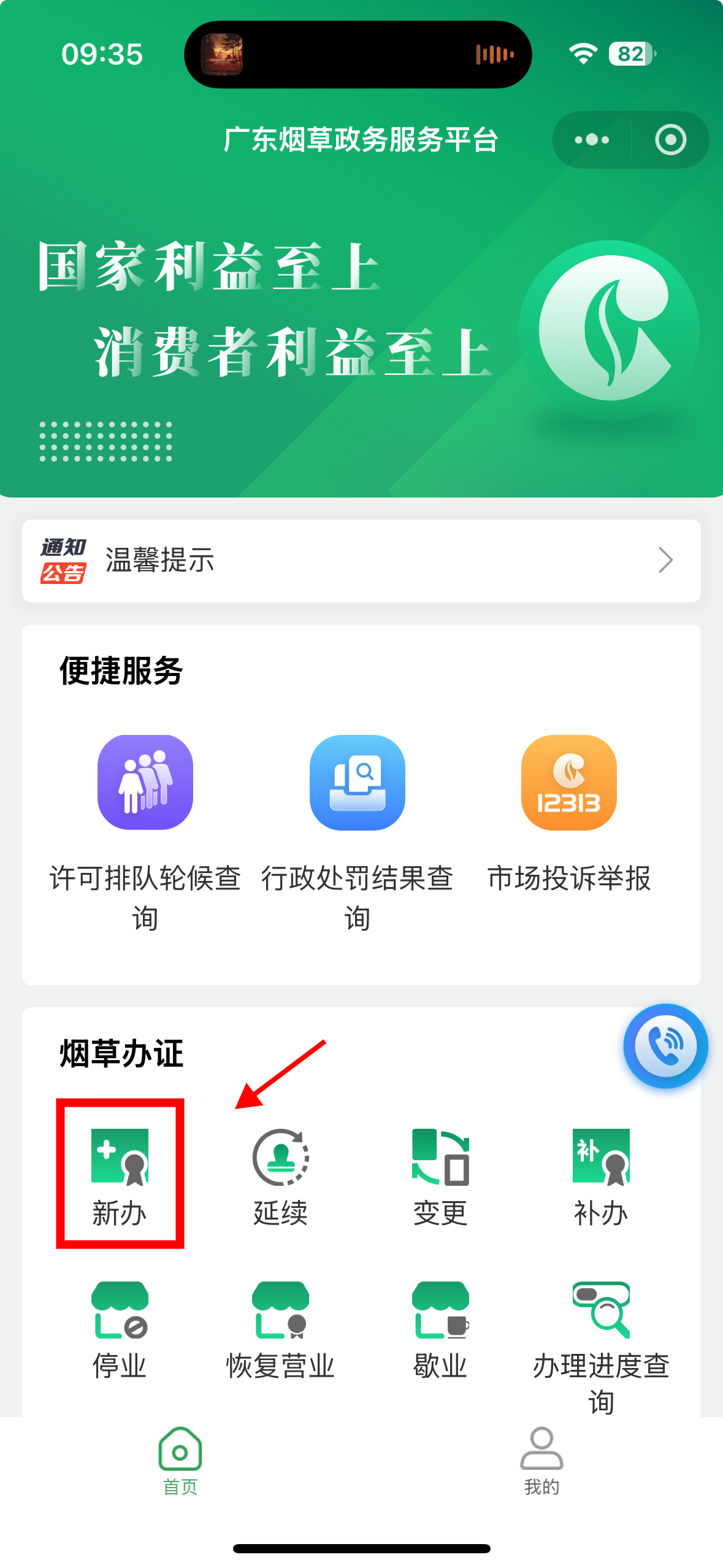 3.“广东烟草政务服务平台”小程序可办理烟草新办、延续、变更、补办、停业、恢复营业、歇业七项办证业务,还可查询许可排队轮候情况。