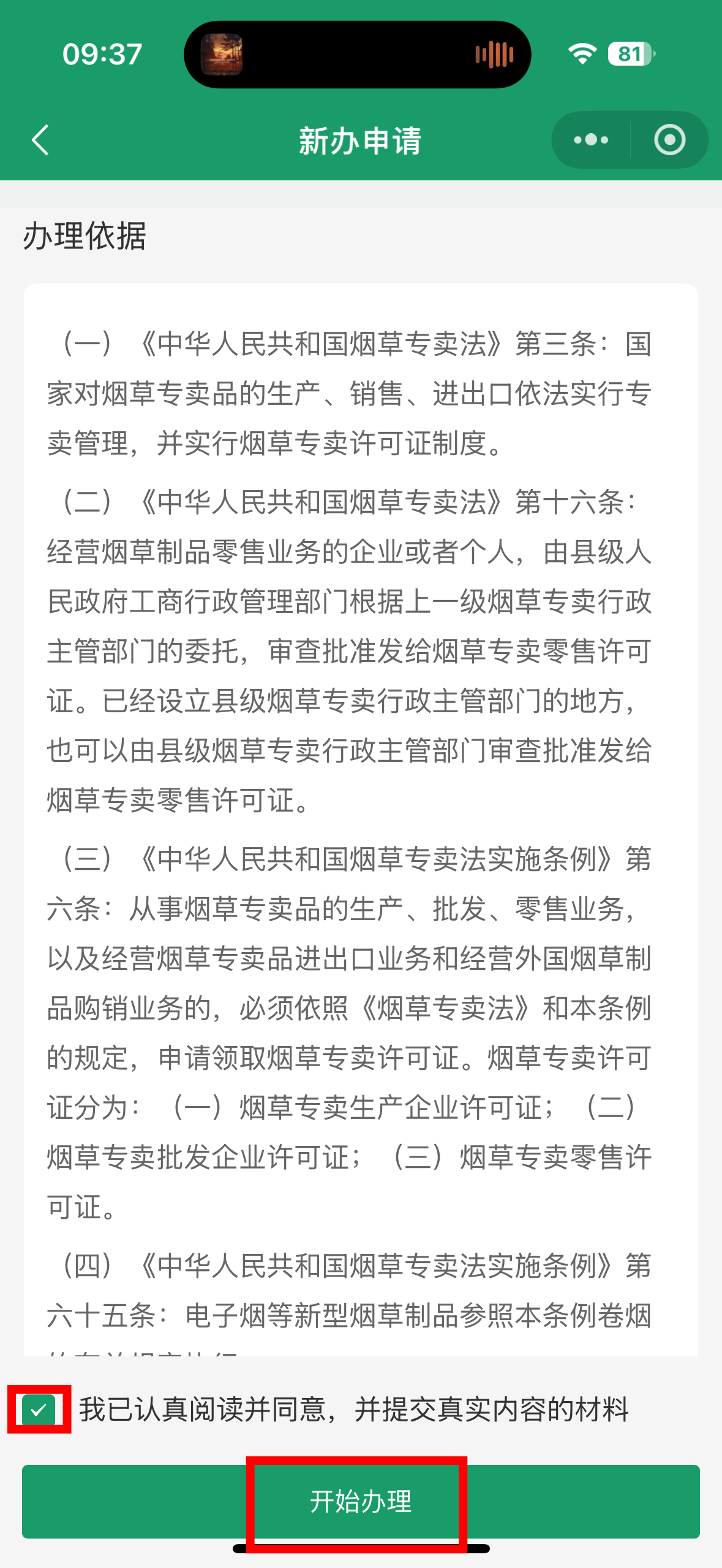 2.进入首页,点击烟草办证业务中的【新办】,浏览办理依据和收取材料后“勾选”我已认真阅读,点击【开始办理】。