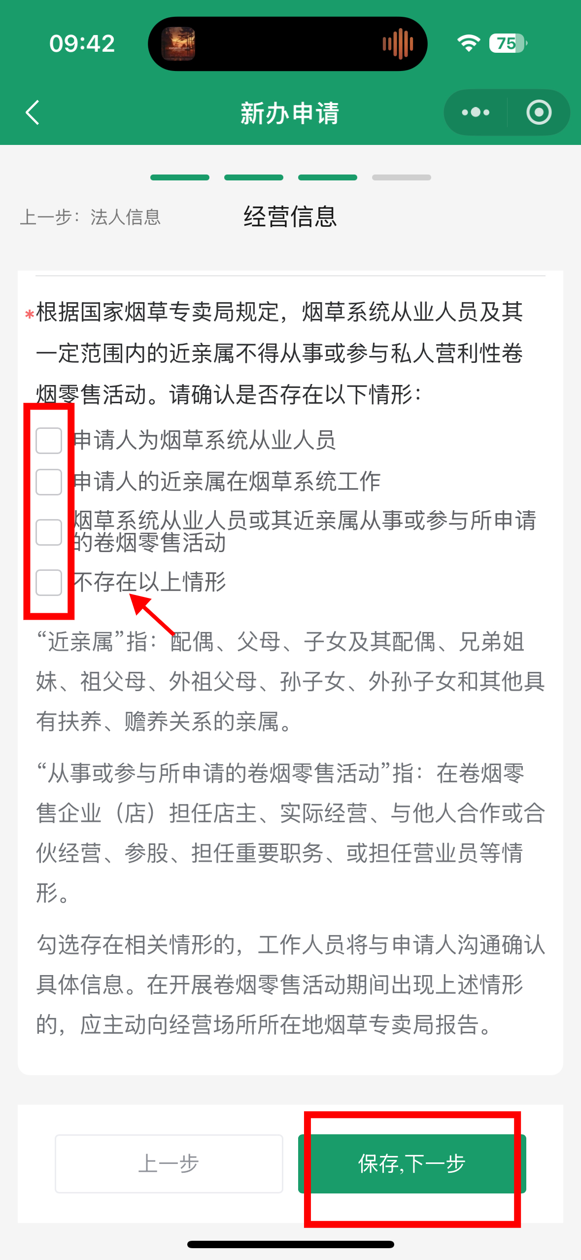 经营信息页面“勾选”是否存在以下情形,点击【保存,下一步】。
