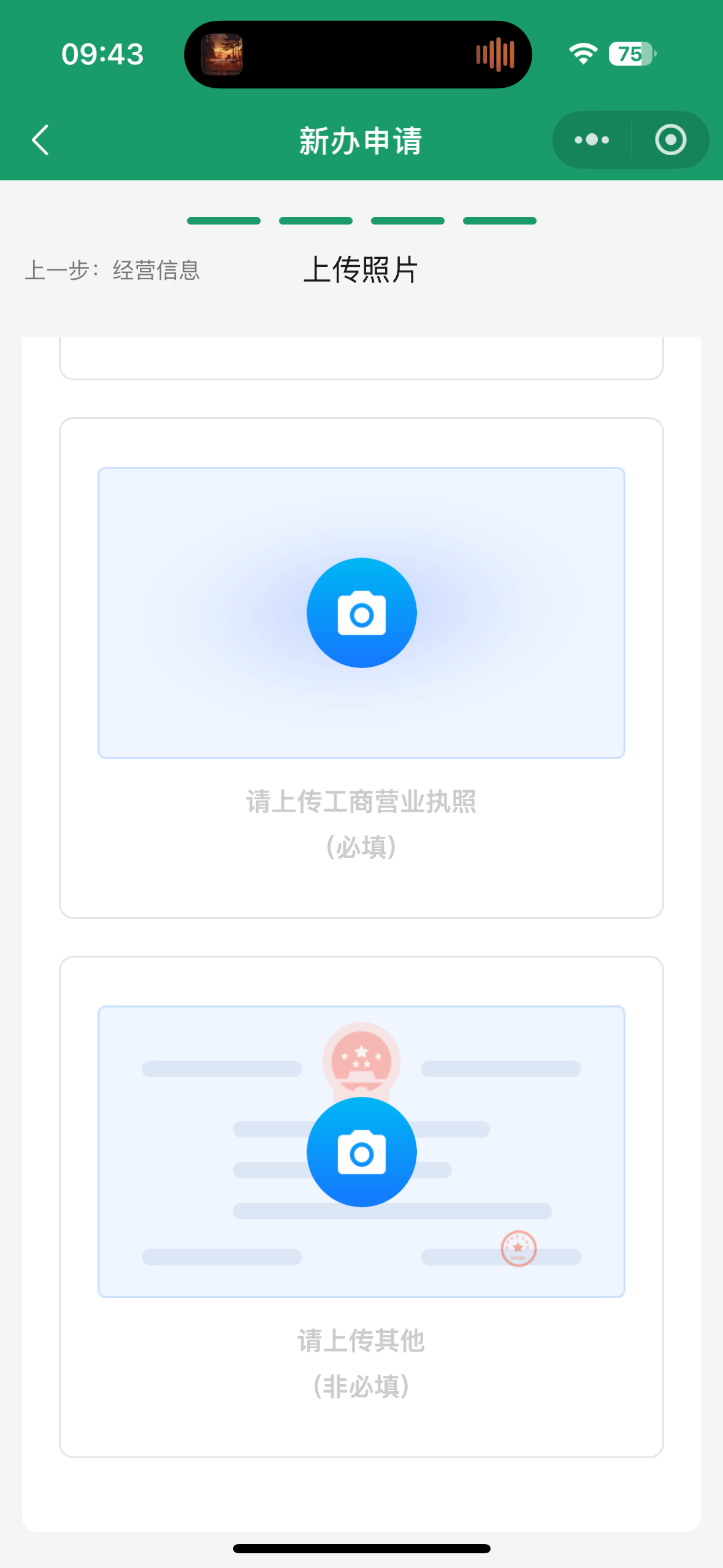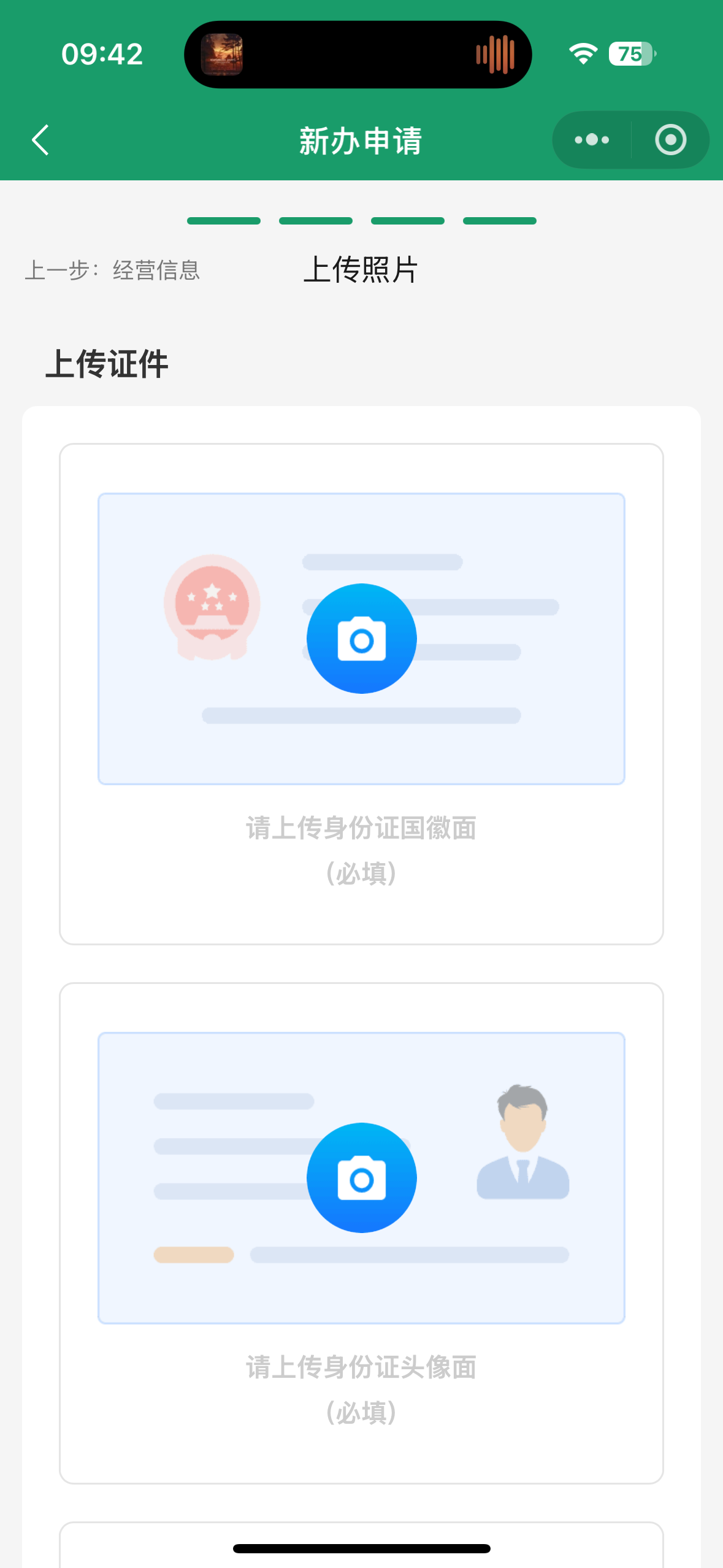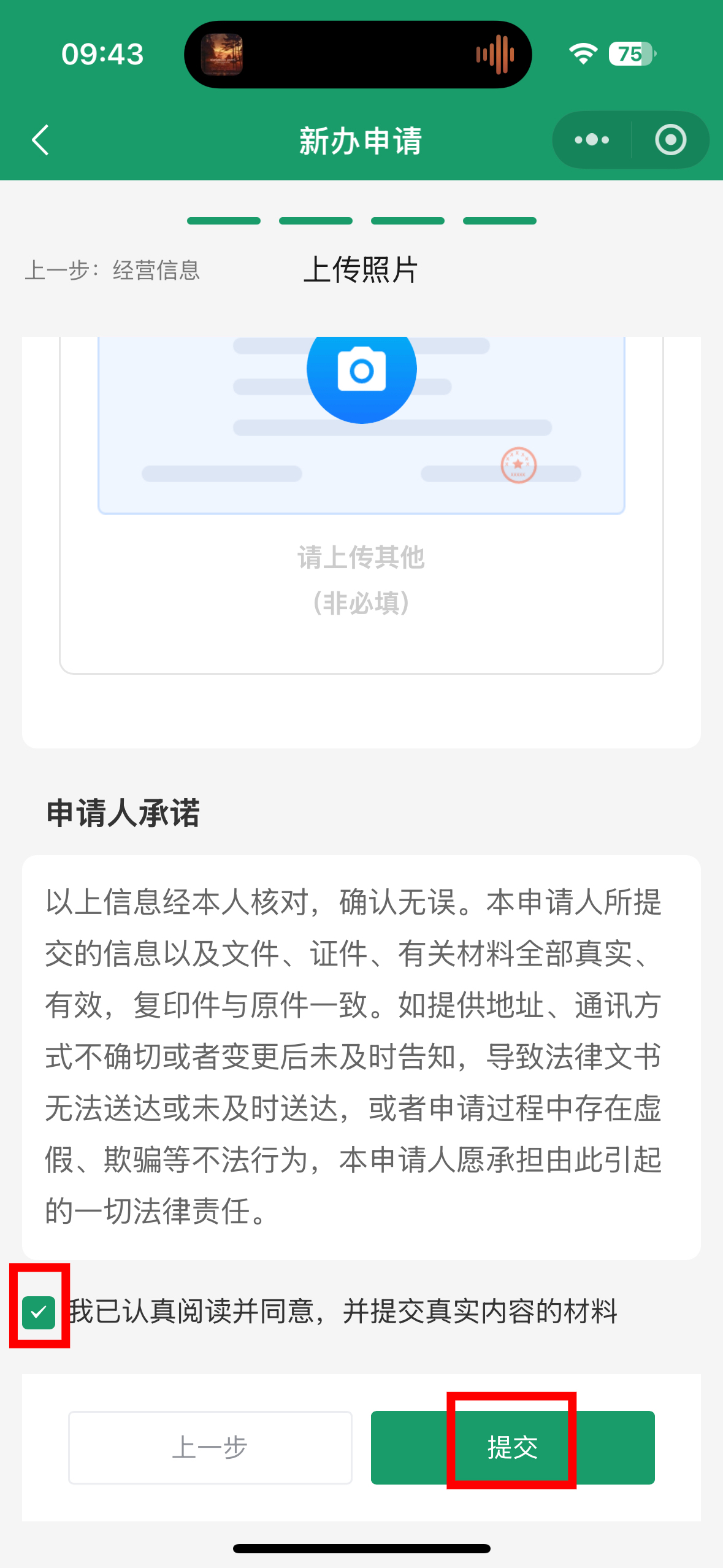 4.进入上传证件页面,根据要求上传身份证正、反面,工商营业执照后,阅读、勾选申请人承诺,点击【提交】。