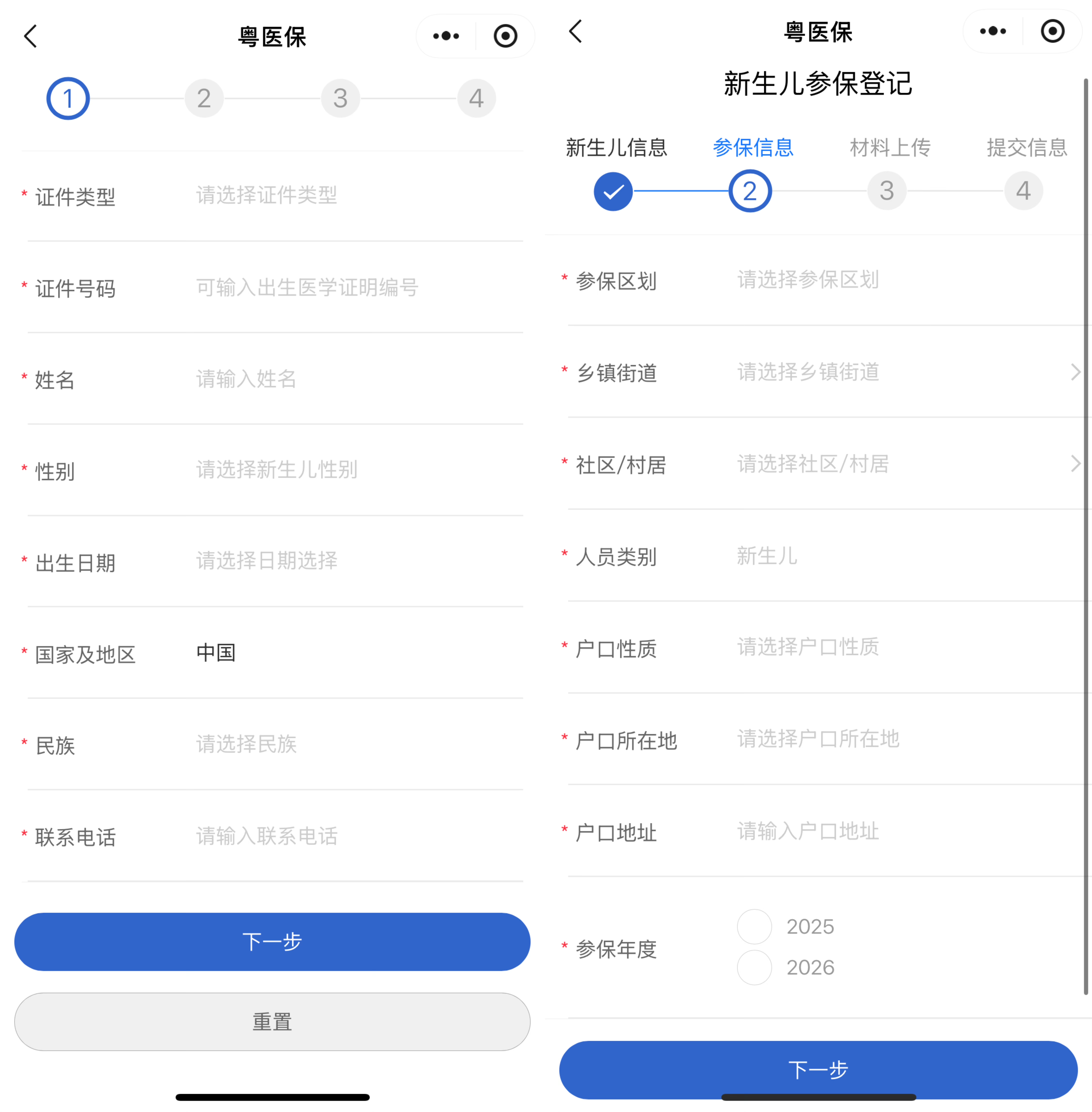 3.进入填写信息页面,如实准确填写新生儿信息,包括新生儿证件类型、证件号码、姓名等,点击【下一步】,填写参保信息,包括参保区划、乡镇街道、社区/村居等,点击【下一步】。