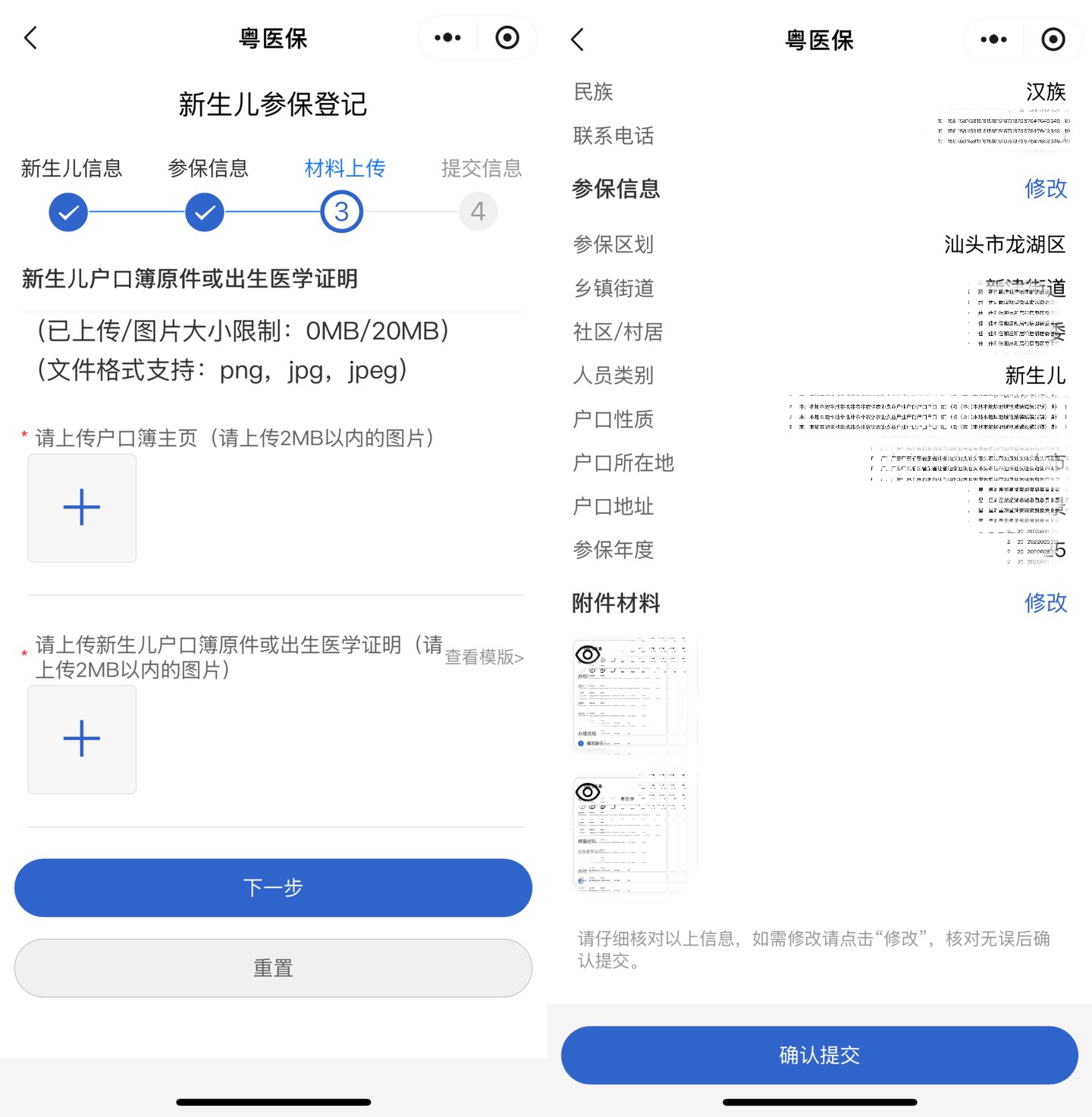 4.根据要求上传户口簿主页及新生儿户口簿原件或出生医学证明图片,点击【下一步】,核对全部信息无误后点击【确认提交】。