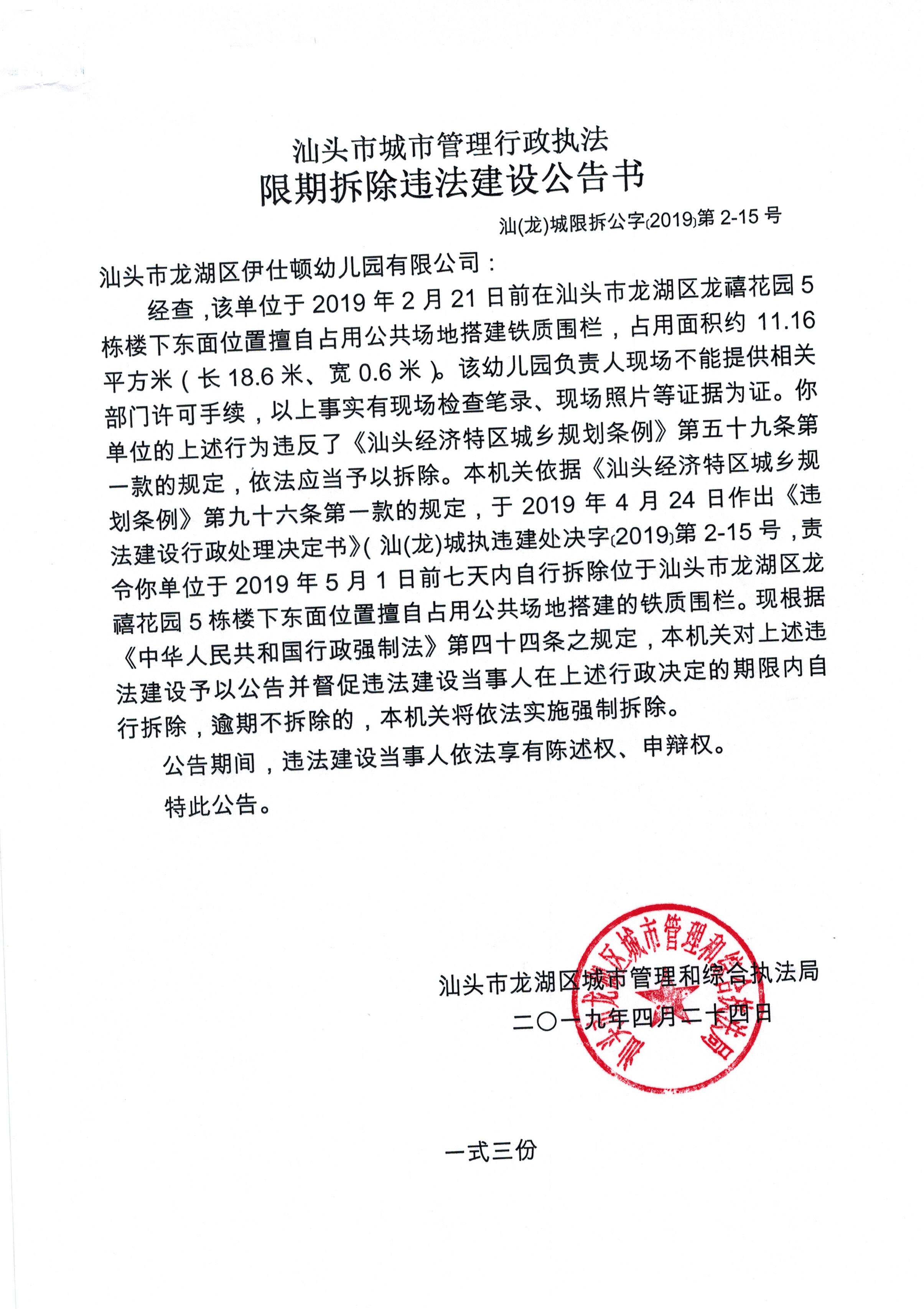 关于汕头市龙湖区伊仕顿幼儿园有限公司违法建设案的强制公告