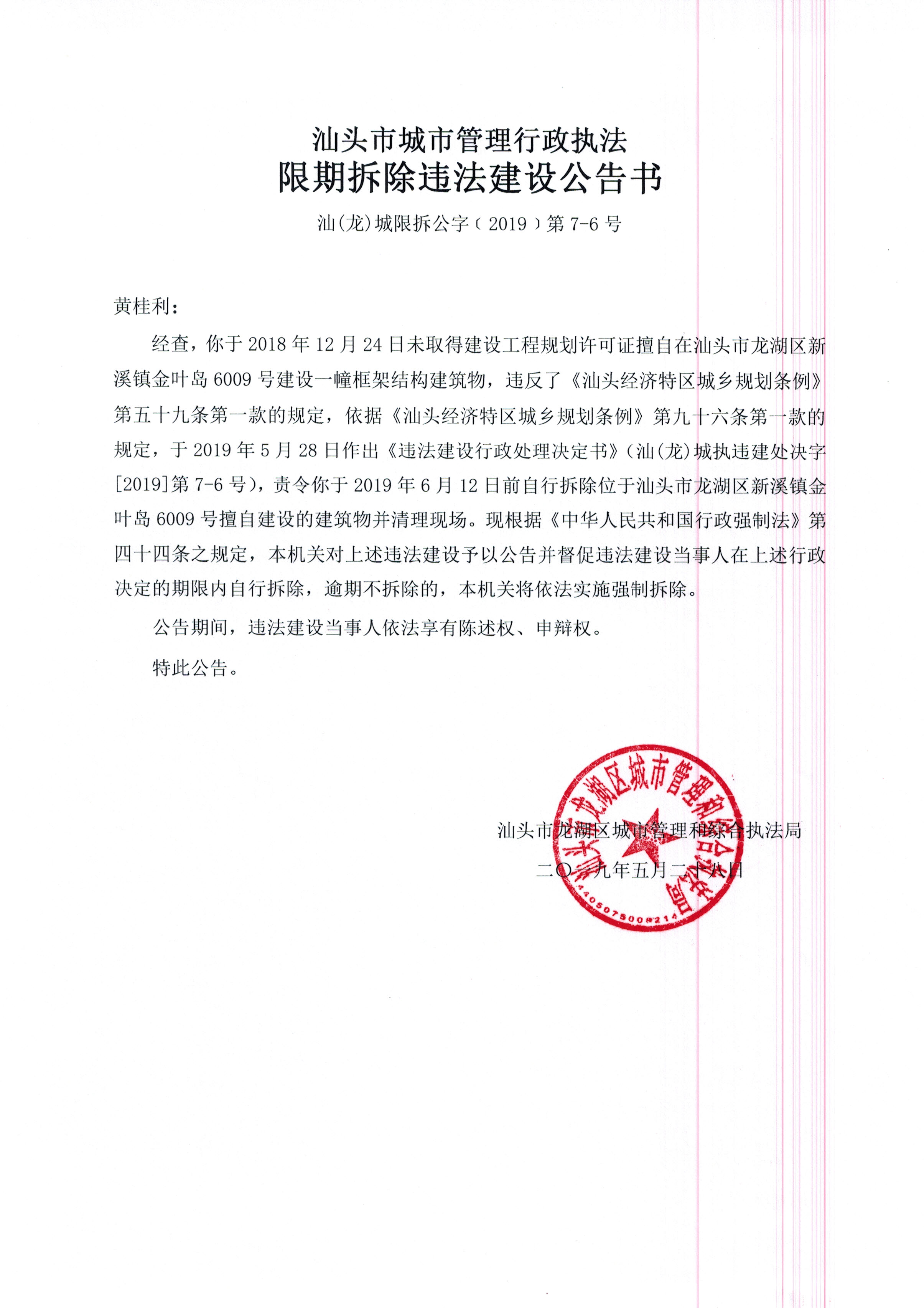 关于黄桂利违法建设案的强制公告