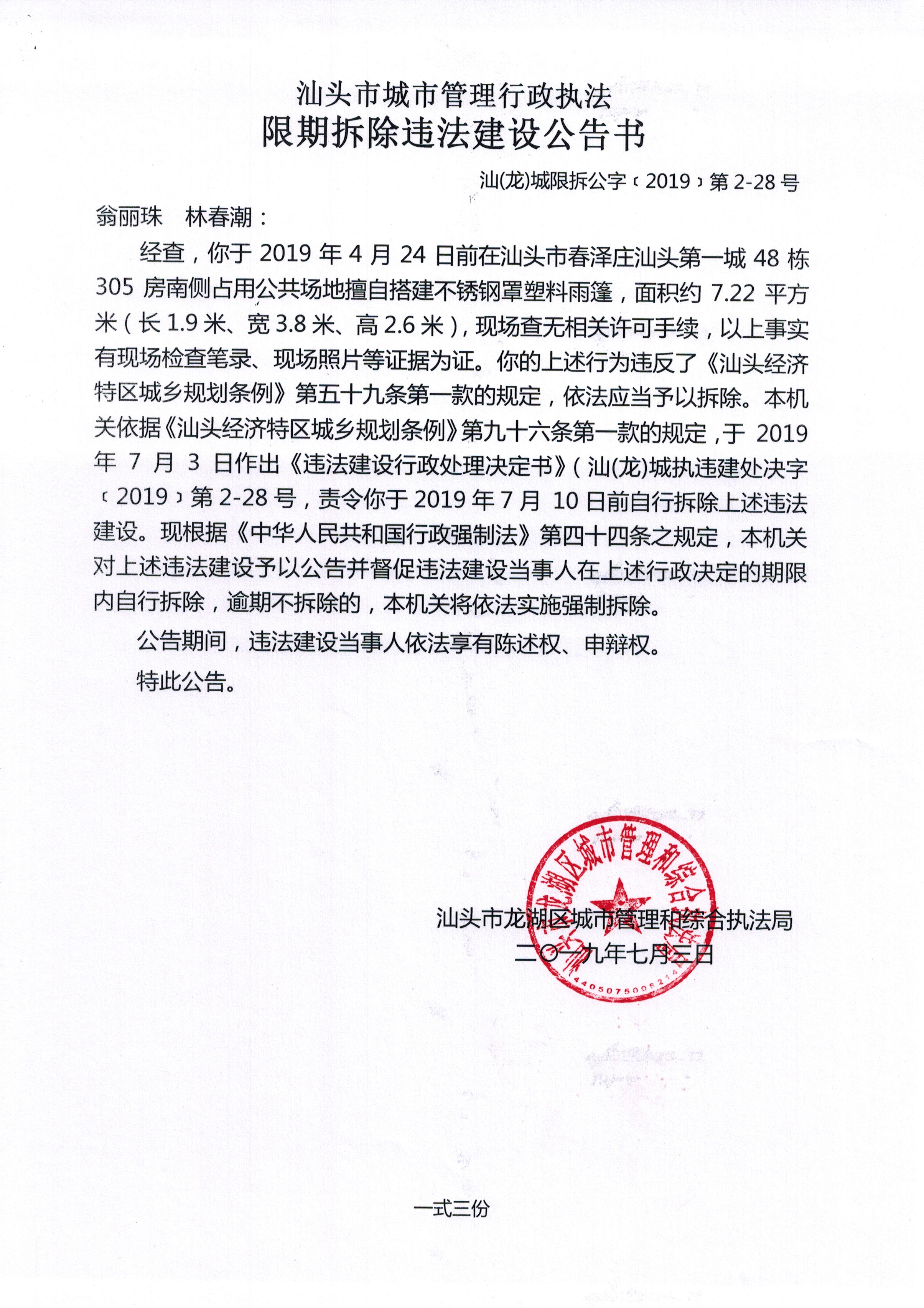 关于翁丽珠、林春潮违法建设案的强制公告