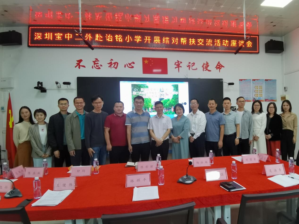为贯彻落实《广东省全口径全方位融入式帮扶粤东粤西粤北地区基础教育高质量发展实施办法》,推进宝安区与龙湖区基础教育结对帮扶各项工作,10月18日,深圳宝安中学第二外国语学校副校长陈彩丽带队,赴汕头市龙湖区诒铭小学开展结对帮扶交流活动。龙湖区教育局副局长林辉平,金珠小学教育集团总校长、结对学校双方部分行政领导及教师代表参加了活动。