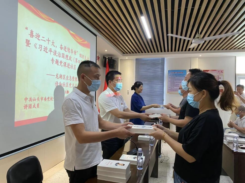 在活动尾声,区应急管理局党委书记、佳和社区党总支书记和朱玲教授向到场的社区党员代表赠予《习近平谈治国理政》第四卷。