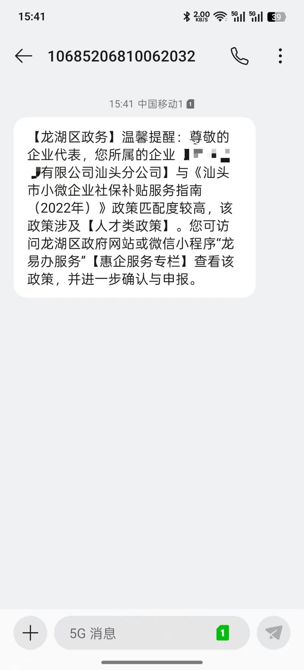 近日,龙湖区多家企业负责人收到一条特别的政务短信,一份标注企业名称、专属政策的“定制礼包”映入眼帘。这是龙湖区在全市率先建成并上线的“政策智能匹配模块”带来的全新体验,以数字化创新破解惠企政策“找不到、读不懂、不会报”的难题。
