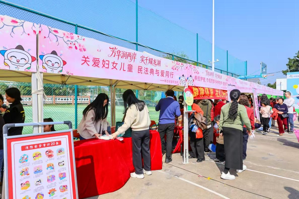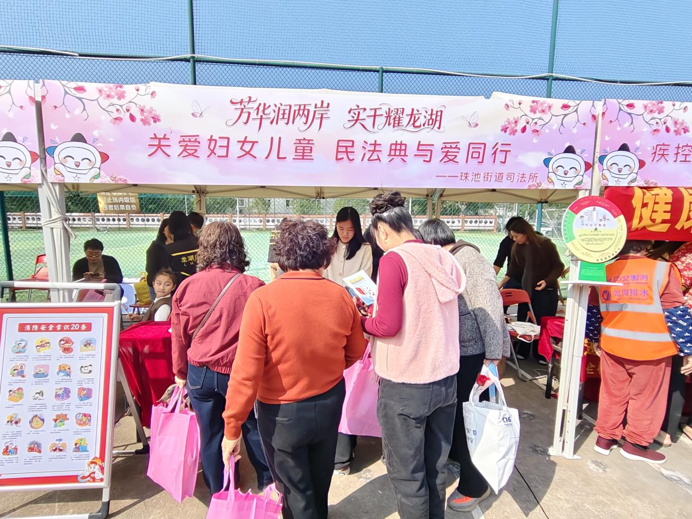 为深入学习贯彻习近平法治思想,深化法治宣传教育工作,在“三八”国际妇女节来临之际,切实增强广大妇女群众的法律意识和维权能力,3月7日下午,由龙湖区妇联、区文广旅体局、珠池街道办事处主办,市体彩中心支持的“芳华润两岸 实干耀龙湖”——纪念“三八”国际妇女节116周年惠民集市在永安全民健身广场举办,活动现场设置了惠民服务、政策宣传、健康义诊等多个区域,吸引了辖区数百名群众参与。龙湖区司法局珠池司法所立足司法行政职能,以现场人流量大、群众参与度高为有利契机,设立“关爱妇女儿童,民法典与爱同行”法律服务摊档,将专业的法律咨询服务送到群众“家门口”。