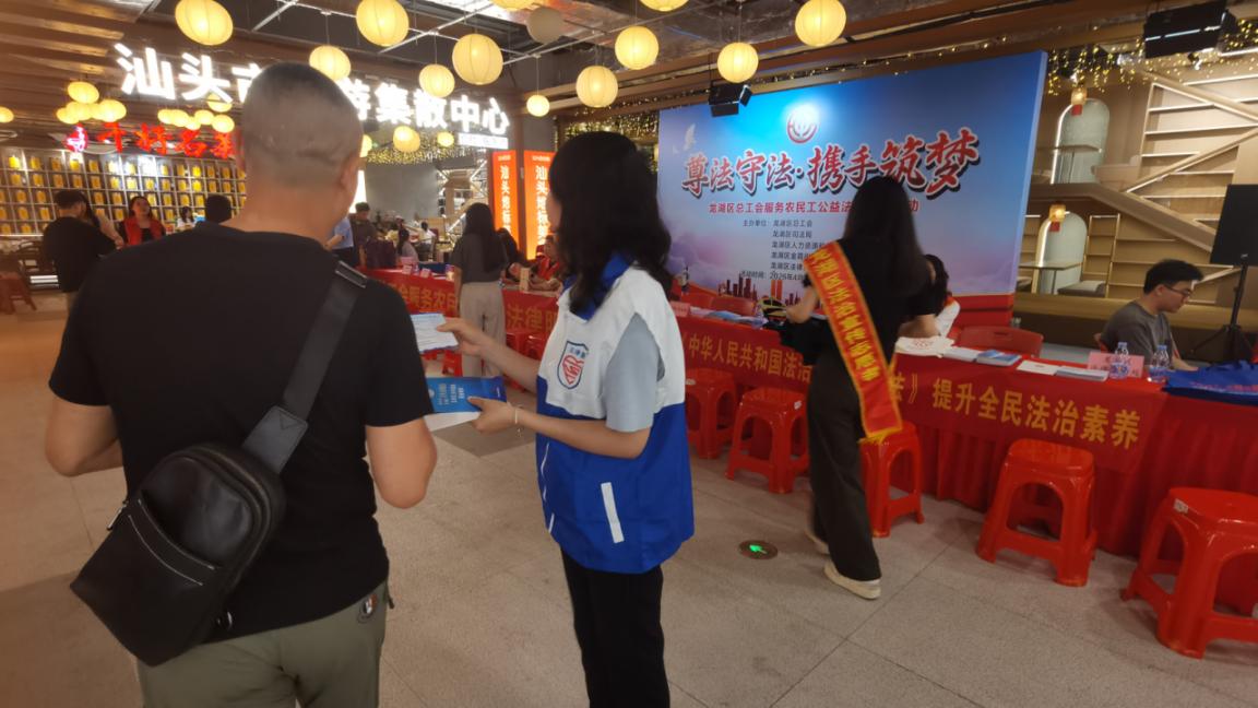 龙湖区法律援助处作为汕头市农民工法律援助品牌建设示范点,近年来积极加强农民工维权法治宣传,定期组织普法宣传活动。2026年4月15日下午,龙湖区司法局与区总工会、区人社局在长平合胜负一楼联合开展“尊法守法携手筑梦”服务农民工公益法律服务行动。