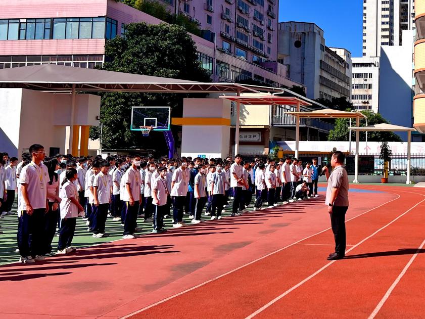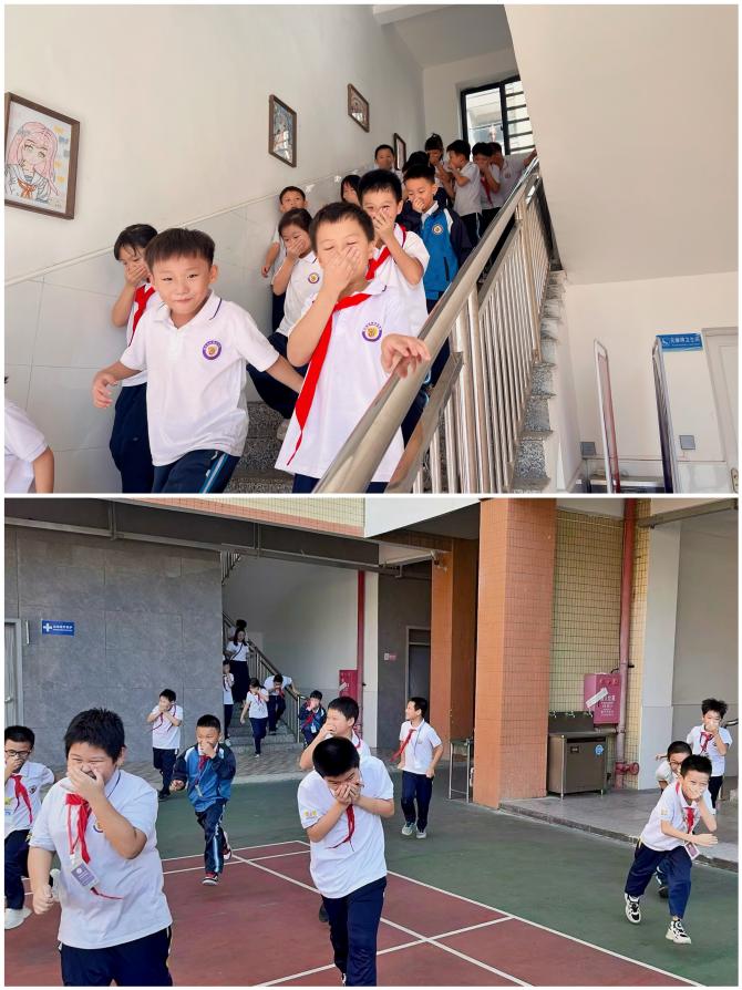 活动开始,随着急促的警报声响起,校园消防安全应急演练正式启动。各班级师生迅速响应,按照预定疏散路线,在班主任及任课教师的引导下,弯腰捂鼻、快速有序地向指定安全区域紧急集结。整个疏散过程紧张有序、规范高效,短时间内便完成全体师生安全撤离,充分展现了学校日常消防安全教育的扎实成效。