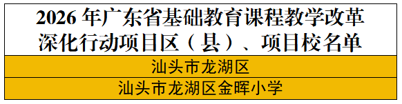 近日,广东省基础教育课程教学改革深化行动项目区(县)、项目校名单正式公布,汕头市龙湖区成功入选“2026年广东省基础教育课程教学改革深化行动项目区”,同时,汕头市龙湖区金晖小学入选“2026年广东省基础教育课程教学改革深化行动项目校”。