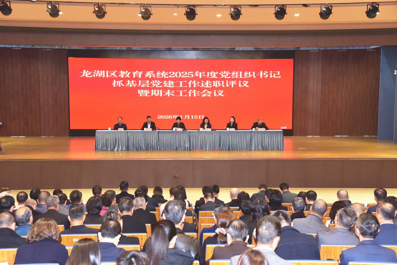 1月15日上午,龙湖区教育系统召开2025年度党组织书记抓基层党建工作述职评议会暨龙湖区2025-2026学年度第一学期期末工作会议,听取校(园)党组织书记抓基层党建工作述职并进行现场评议,总结部署龙湖教育工作。区委教育工委领导班子成员、局党组班子成员、各股室负责人,区教师发展中心班子成员,各公、民办中小学和公办幼儿园党组织书记、校(园)长及民办幼儿园党支部书记,区有关受邀的党代表、人大代表和政协委员参加会议。