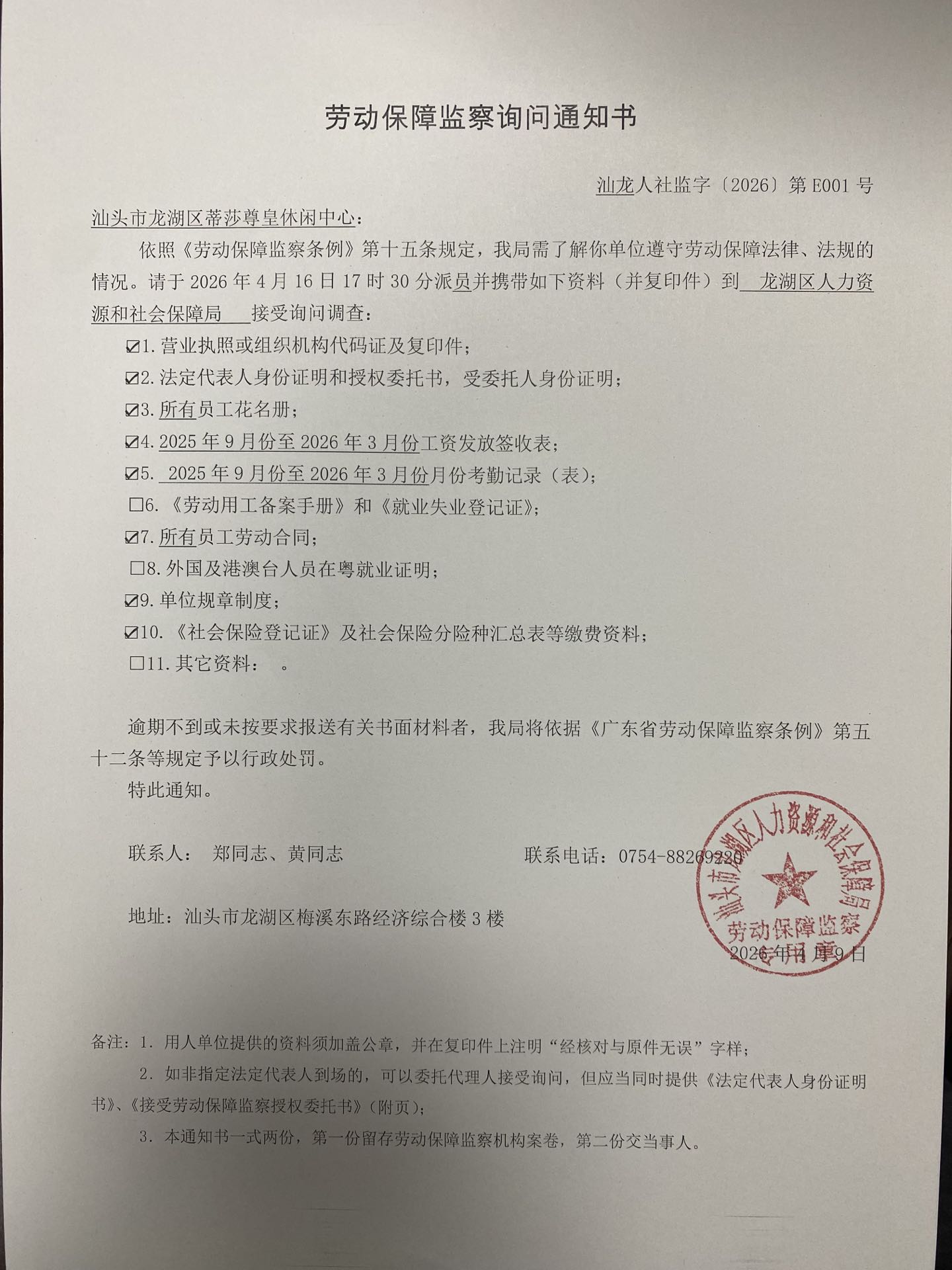 依照《广东省劳动保障监察条例》第四十一条规定,现公告通知你于2026年4月16日17时30分前到我局龙湖区人力资源和社会保障局接受调查并配合处理。
