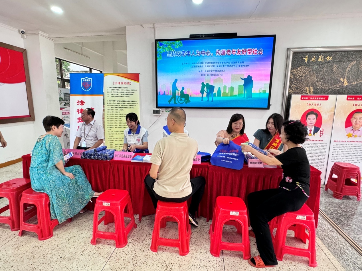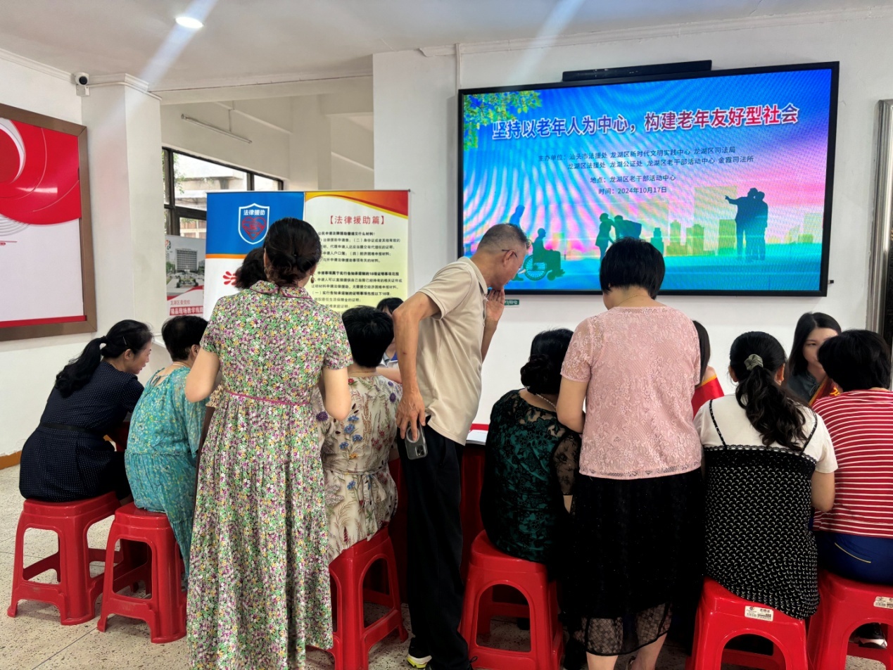 为贯彻落实积极应对人口老龄化国家战略,弘扬中华民族孝亲敬老传统美德,维护老年人合法权益,大力营造养老孝老敬老社会氛围,2024年10月17日上午,汕头市法律援助处、龙湖区法律援助处联合龙湖公证处、金霞司法所走进龙湖区老年人活动中心开展“坚持以老年人为中心,构建老年友好型社会”为主题的“敬老月”志愿服务活动。