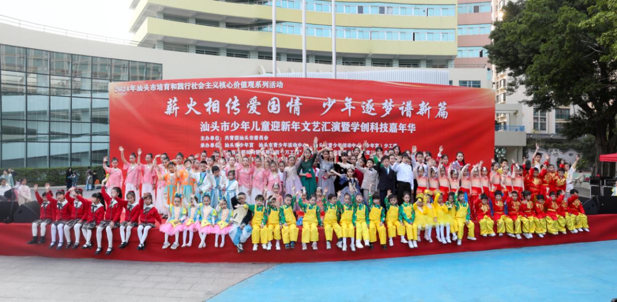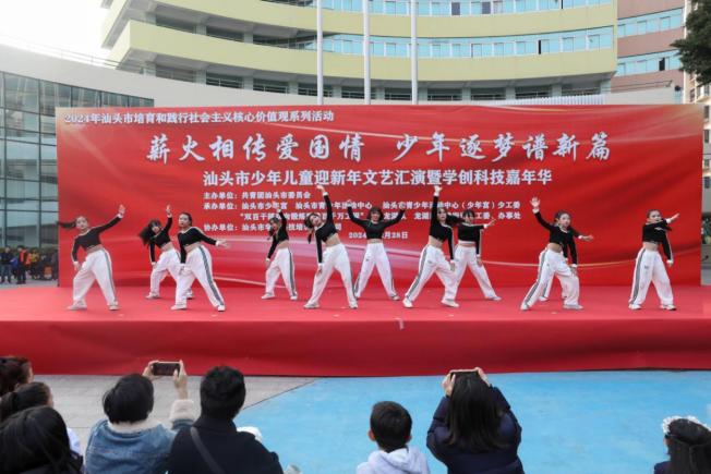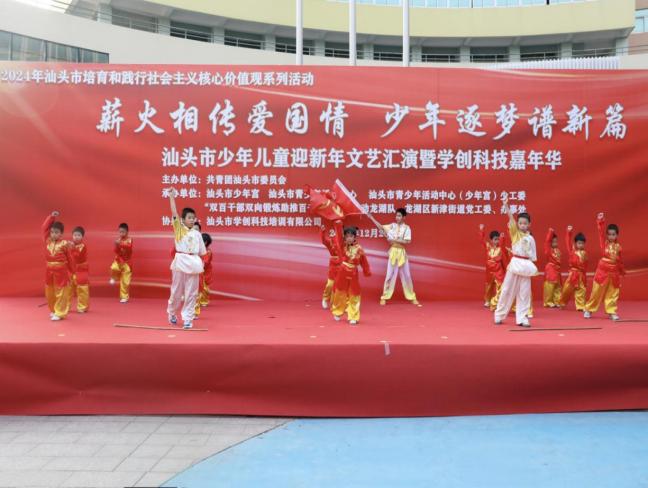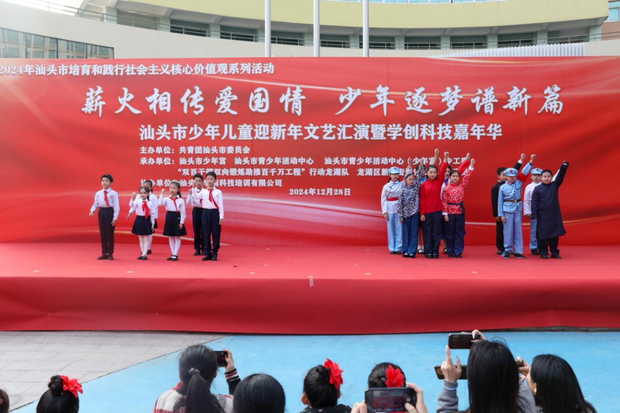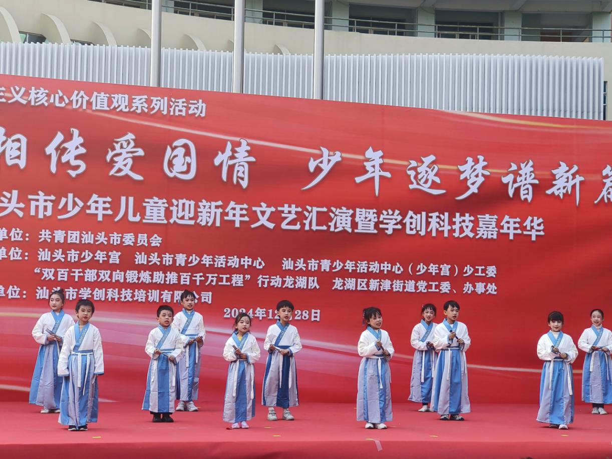 在元旦佳节即将来临之际,为深入贯彻党的二十届三中全会精神,着力培育青少年自觉践行社会主义核心价值观的意识,激发辖区青少年积极展示自身特长与才华的热情,12月28日下午,新津街道联合共青团汕头市委员会、汕头市少年宫和“双百干部双向锻炼助推‘百千万工程’”行动龙湖队等单位,在汕头市青少年活动中心共同举办了 “薪火相传爱国情 少年逐梦谱新篇”—— 我在新时代文明实践中心过元旦活动。